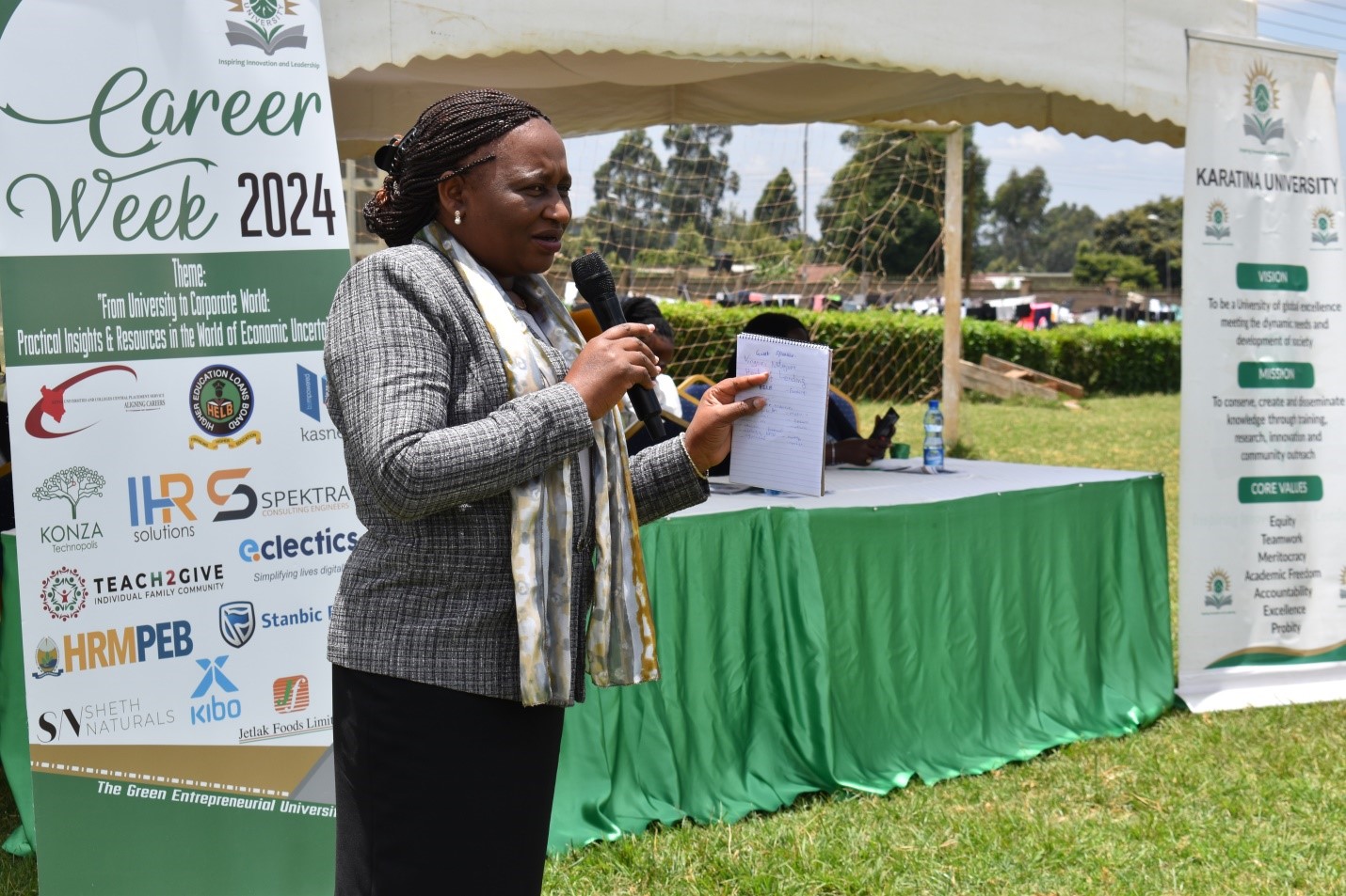 The Ag DVC ARSA Prof Hellen Kamiri addressing the audience during the launch of the 12th Career Week